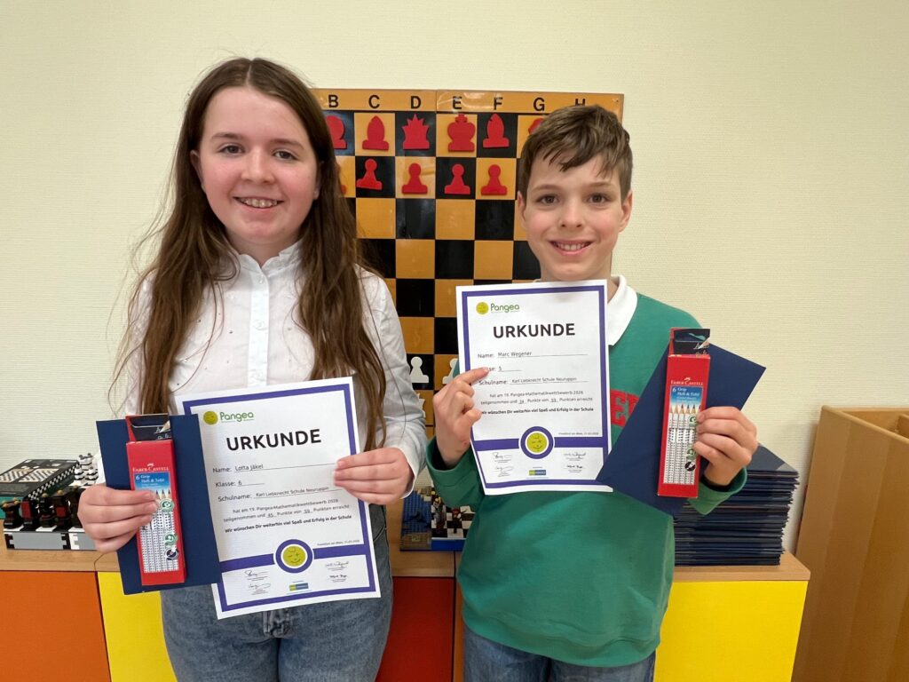 Erstmalig führte die Fachkonferenzleiterin Frau Görn den Pangea-Mathematik-Wettbewerb für die Jahrgangsstufen 5 und 6 an unserer Schule durch. Am heutigen Tag erfolgte die Siegerehrung in der ersten großen Pause. Die beiden Bestplatzierten, Lotta Jäkel (6b) und Marc Wegener (5a), erhielten neben Urkunden noch kleine Präsente. Am 22.04.2026 folgt für Lotta dann die Zwischenrunde, für die sie sich als einzige qualifiziert hat. Sie zählt zu den besten 500 Schülerinnen und Schülern in diesem Wettbewerb (bei 77000 Teilnehmern deutschlandweit).
