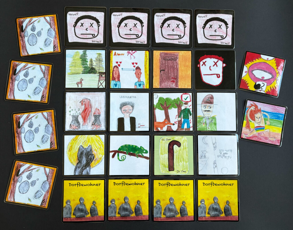 Das beliebte Gesellschaftsspiel „Die Werwölfe von Düsterwald“ gibt es jetzt auch als exklusives Einzelstück in der „Edition Klasse 6b“, denn im Kunstunterricht wurde ein eigenes Kartendeck entworfen. Neben den bekannten Charakteren – Werwölfe, Dorfbewohner, stotternder Richter etc. – gibt es hier auch eine geheimnisvolle Nachtkatze, ein wandelbares Chamäleon und eine resolute Oma. Das Amt des Bürgermeisters wird hier vom Schulleiter übernommen, der Ritter mit der rostigen Klingen musste seinen Job an den Sheriff abtreten. Im strengen Praxistest am Freitag, 17.4.2026, hat sich diese Spielversion durchaus bewährt.