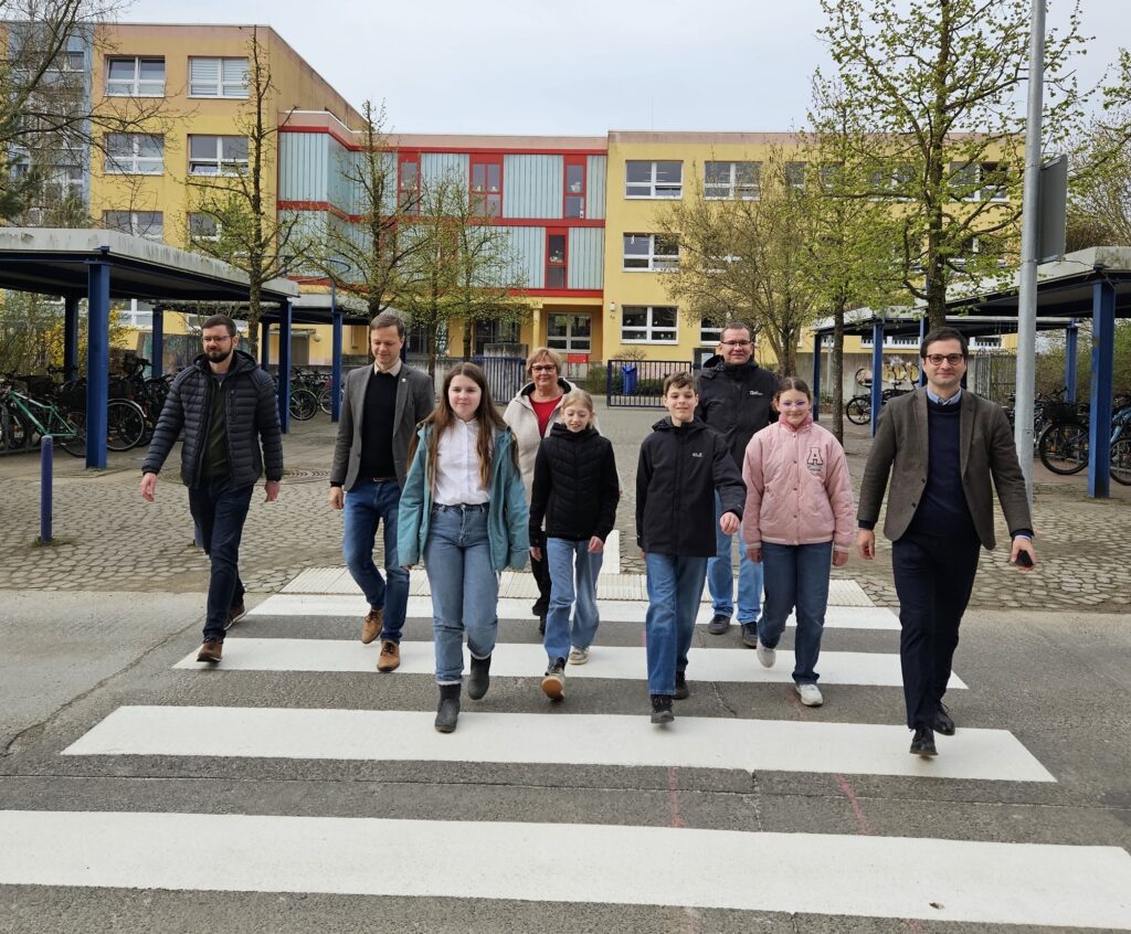 Getestet und für gut befunden! Am heutigen Dienstag eröffneten Bürgermeister Nico Ruhle und Baudezernet Jan Juraschek den Fußgängerüberweg in der Franz-Mehring-Straße, der in den Osterferien gebaut wurde, gemeinsam mit unseren Schülersprechern sowieso Schulleiter Mathias Jäkel und der stellvertretenden Hortleiterin Beate Pieler.