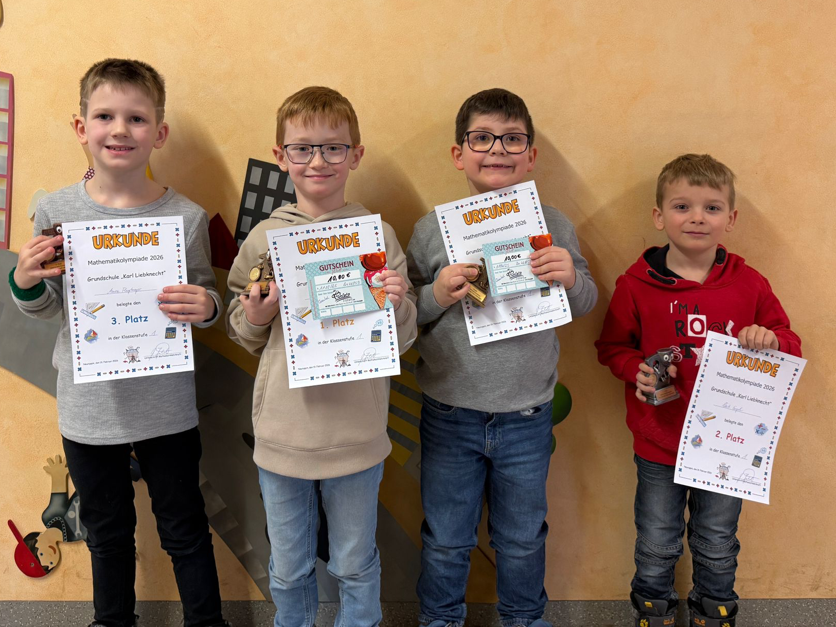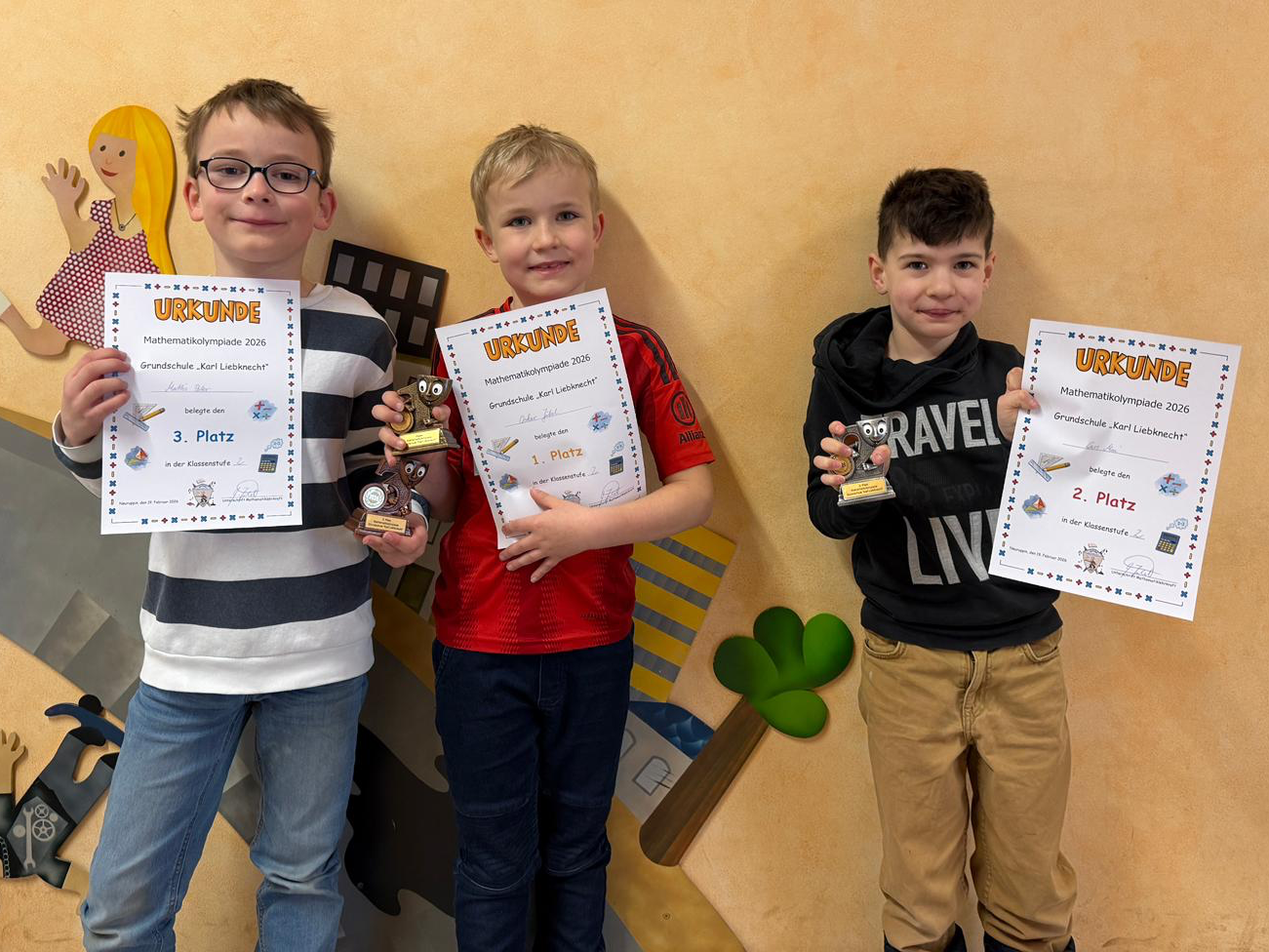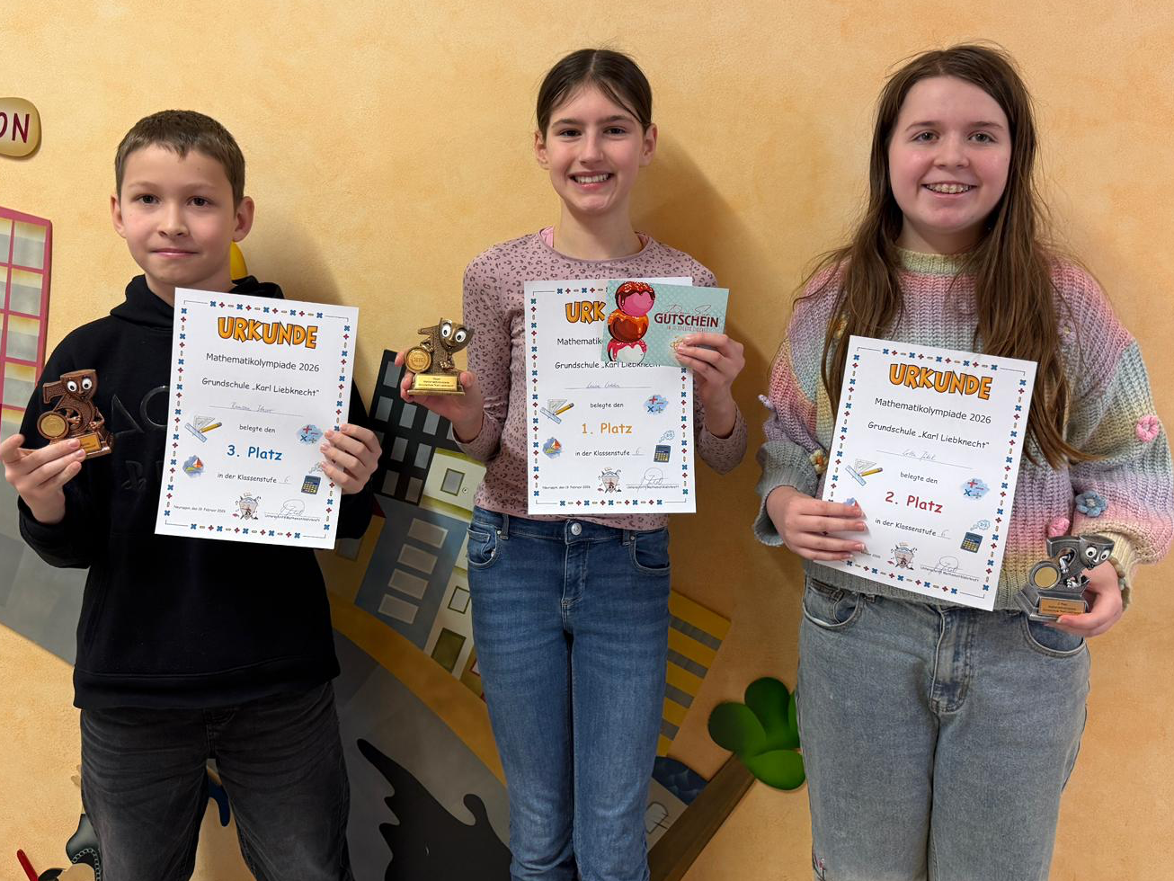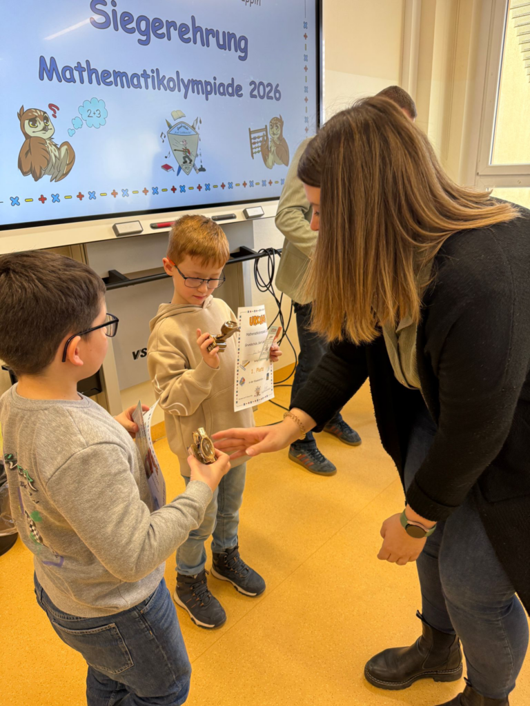 65 Schülerinnen und Schüler, die sich teilweise im klasseninternen Vorausscheid durchgesetzt hatten, traten bei der 53. Mathematikolympiade unserer Schule am Donnerstag, 19.02.2026, an. In einer Unterrichtsstunde galt es, knifflige Aufgaben zu bewältigen, die nichts mit dem „normalen“ Unterrichtsstoff zu tun haben. Problemlösungen waren gefragt, ebenso Durchhaltevermögen beim Knobeln. Am heutigen Freitag erfolgte die Siegerehrung durch die Fachkonferenzleiterin Frau Görn und den Schulleiter Herrn Jäkel im Schachraum.